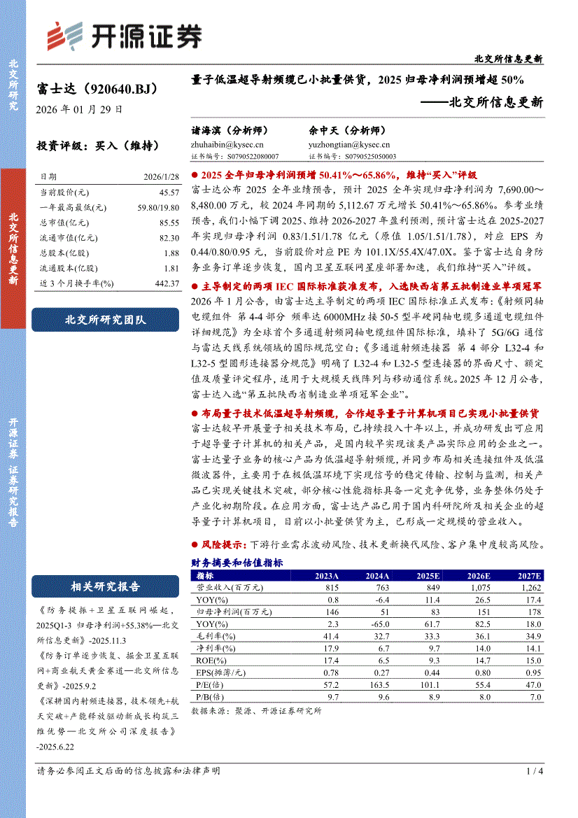 富士达:开源证券-富士达-920640-北交所信息更新:量子低温超导射频缆已小批量供货,2025归母净利润预增超50%-260129