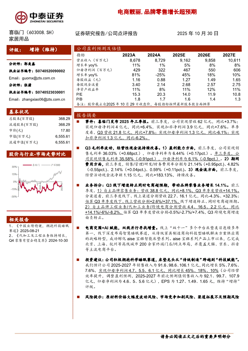 喜临门:中泰证券-喜临门-603008-电商靓丽,品牌零售增长超预期-251030