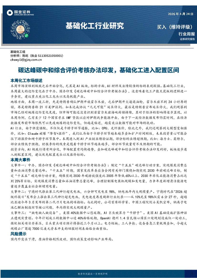 基础化工行业:国金证券-基础化工行业周报:碳达峰碳中和综合评价考核办法印发,基础化工进入配置区间-260424