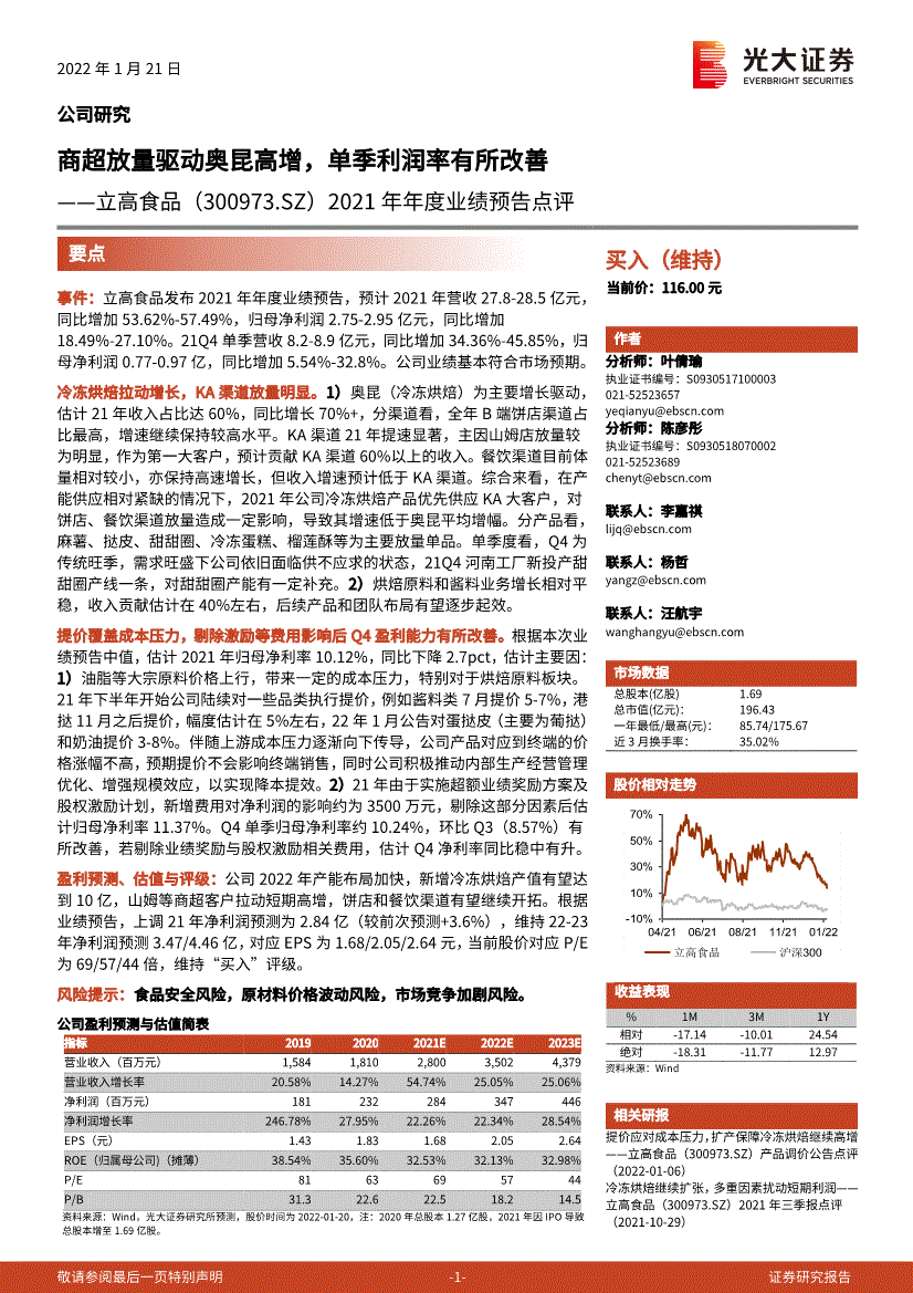 立高食品:光大证券-立高食品-300973-2021年年度业绩预告点评:商超放量驱动奥昆高增,单季利润率有所改善-220121