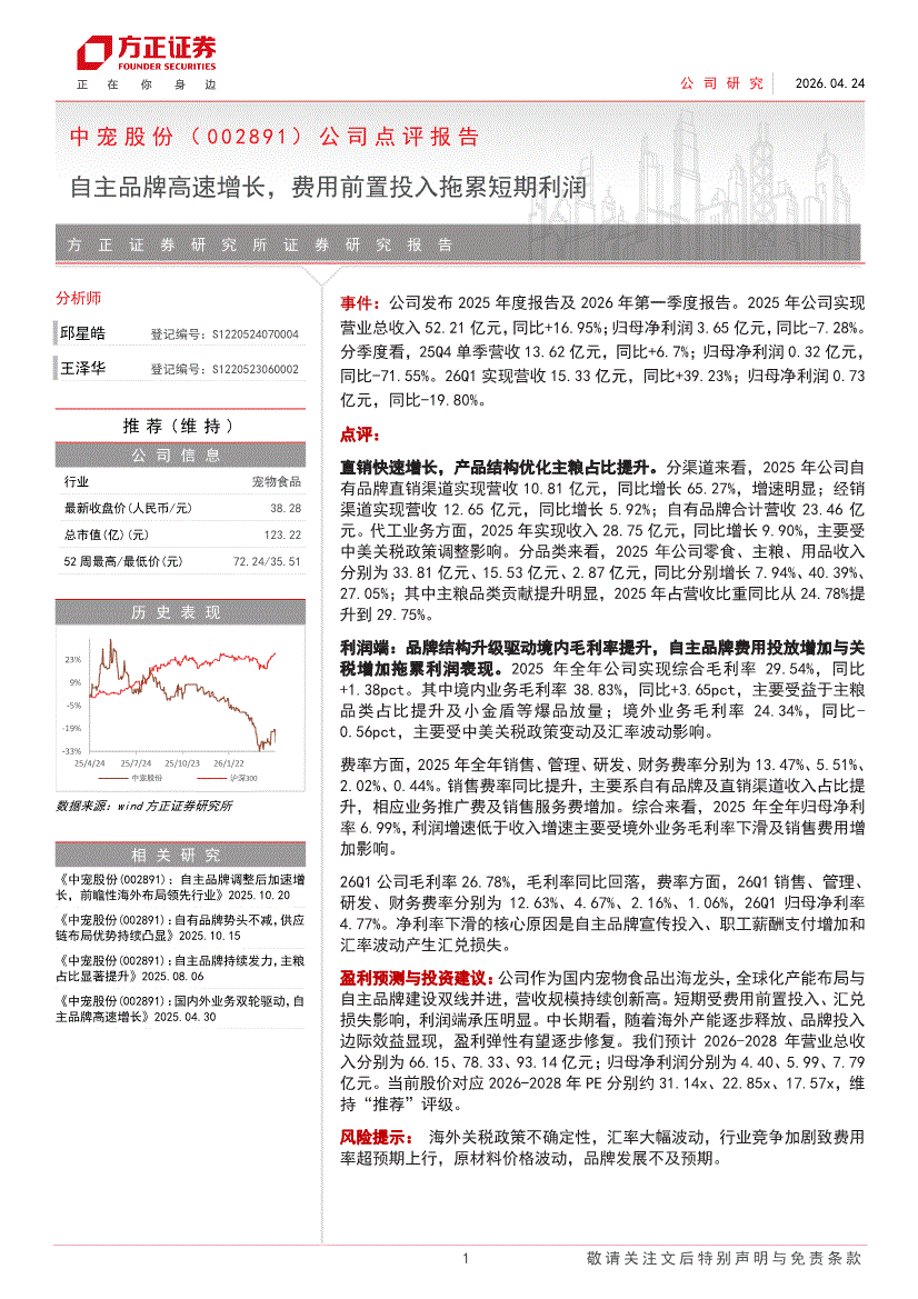 中宠股份:方正证券-中宠股份-002891-公司点评报告:自主品牌高速增长,费用前置投入拖累短期利润-260424