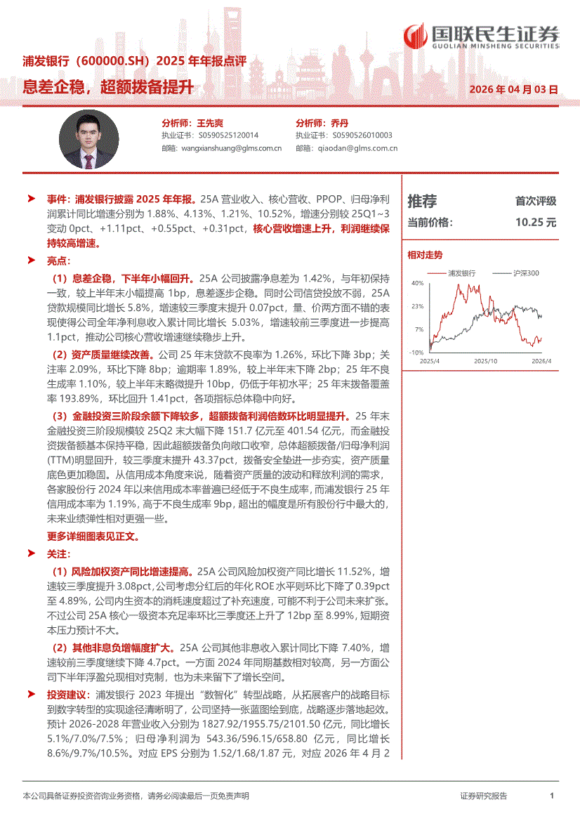 浦发银行:国联民生证券-浦发银行-600000-2025年年报点评:息差企稳,超额拨备提升-260403