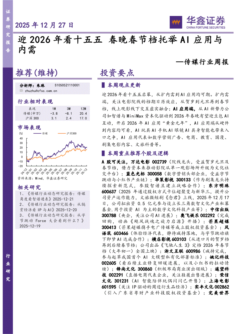 传媒行业:华鑫证券-传媒行业周报:迎2026年看十五五春晚春节档托举AI应用与内需-251227
