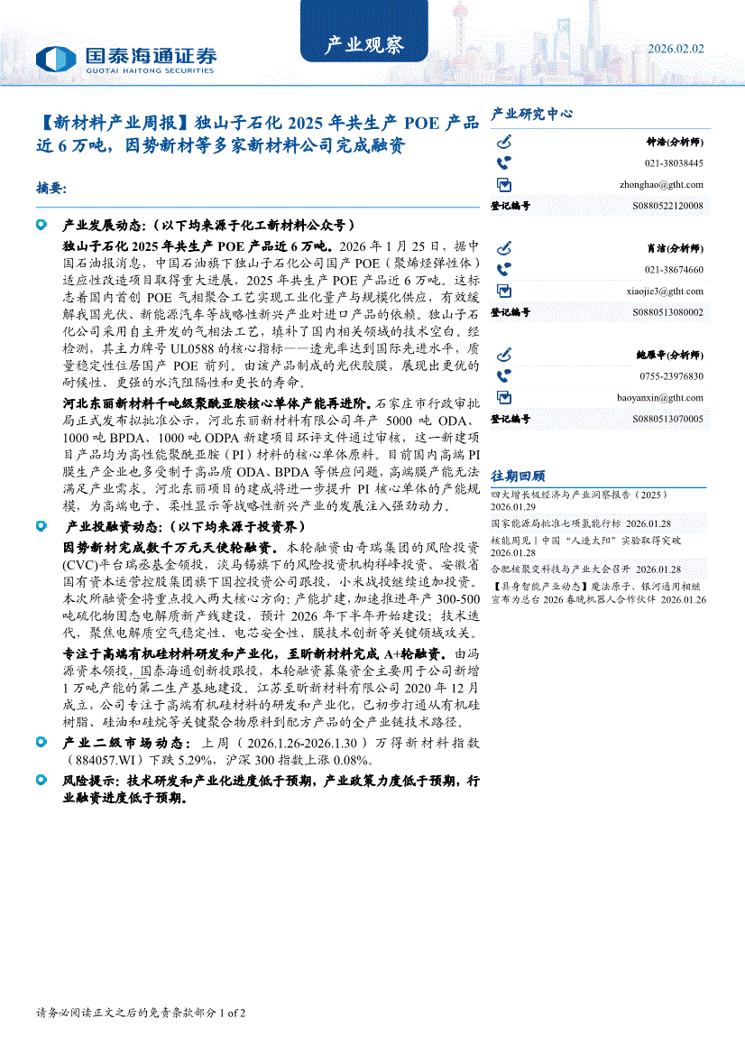 国泰海通证券-产业观察:【新材料产业周报】独山子石化2025年共生产POE产品近6万吨,因势新材等多家新材料公司完成融资-260202