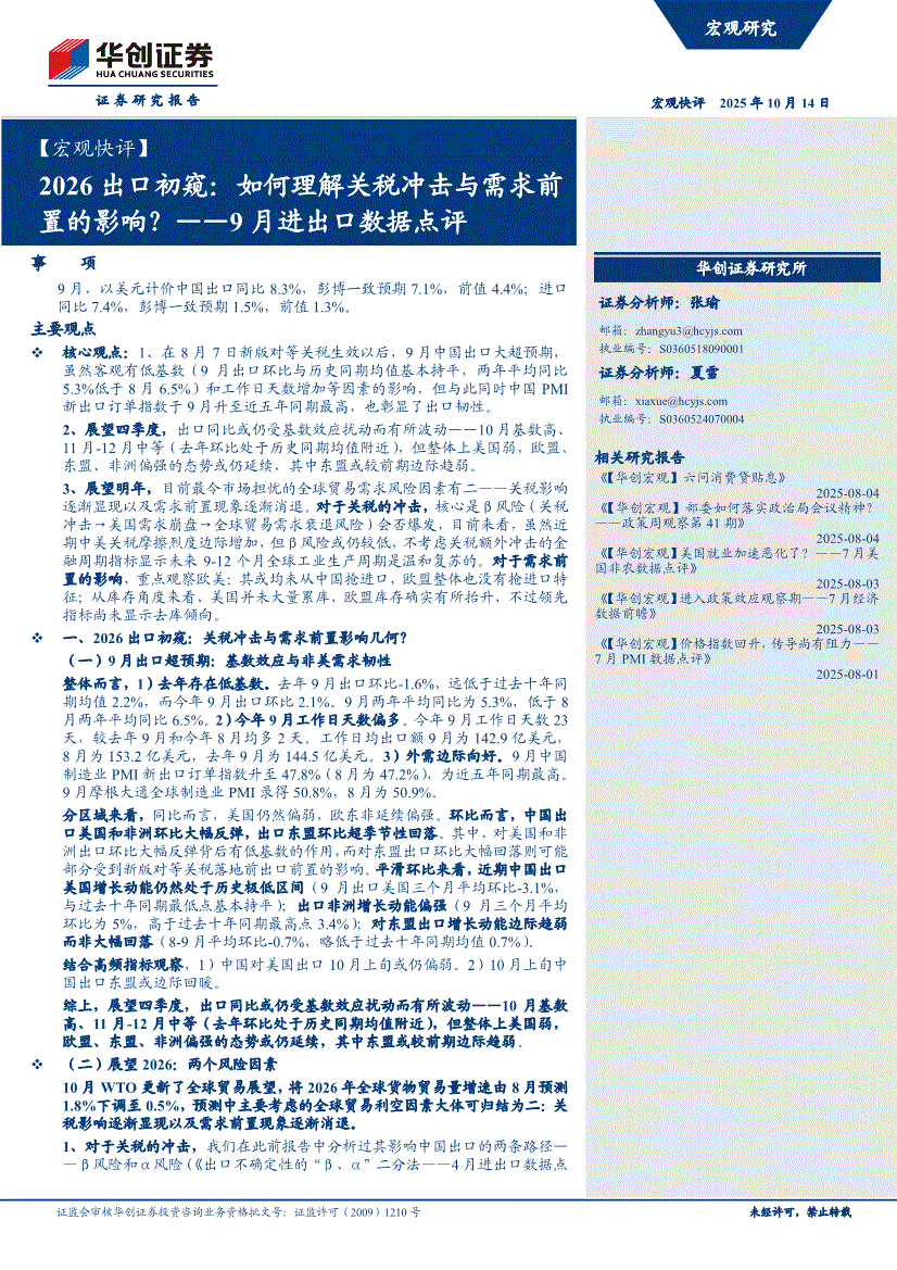 华创证券-【宏观快评】2026出口初窥:如何理解关税冲击与需求前置的影响?——9月进出口数据点评-251014