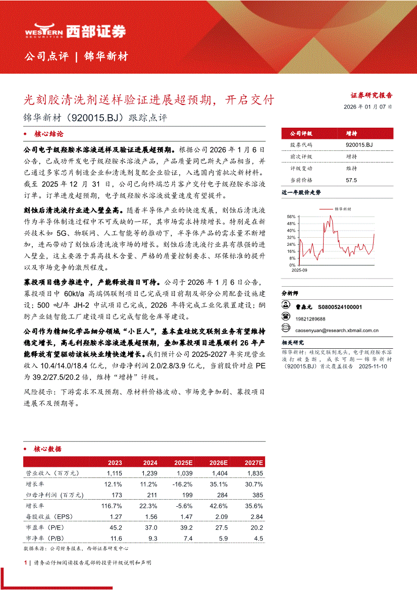 锦华新材:西部证券-锦华新材-920015-跟踪点评:光刻胶清洗剂送样验证进展超预期,开启交付-260107