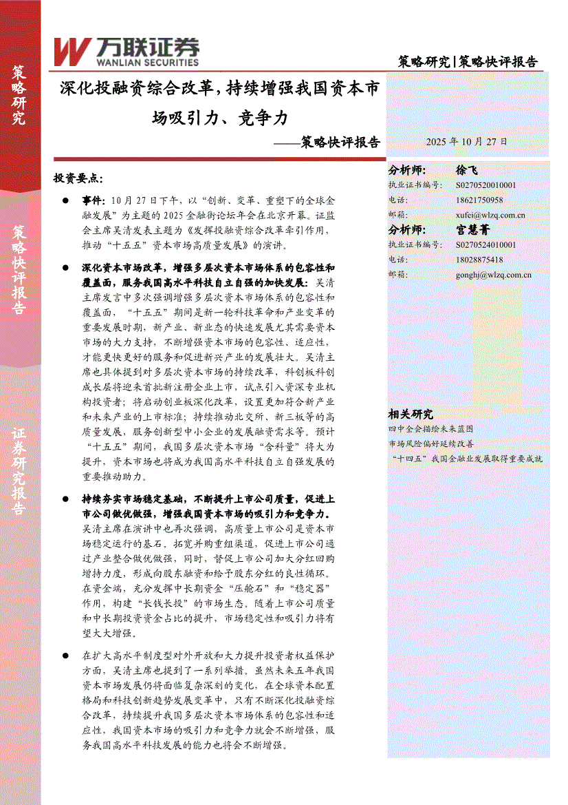 万联证券-策略快评报告:深化投融资综合改革,持续增强我国资本市场吸引力、竞争力-251027