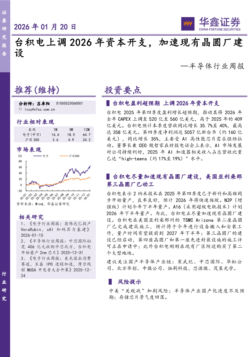 半导体行业:华鑫证券-半导体行业周报:台积电上调2026年资本开支,加速现有晶圆厂建设-260120