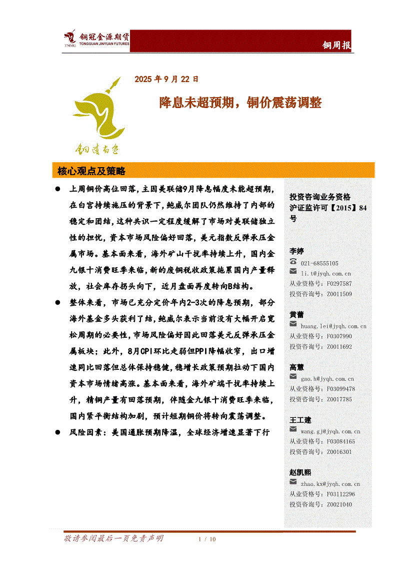 铜冠金源期货-铜周报:降息未超预期,铜价震荡调整-250922