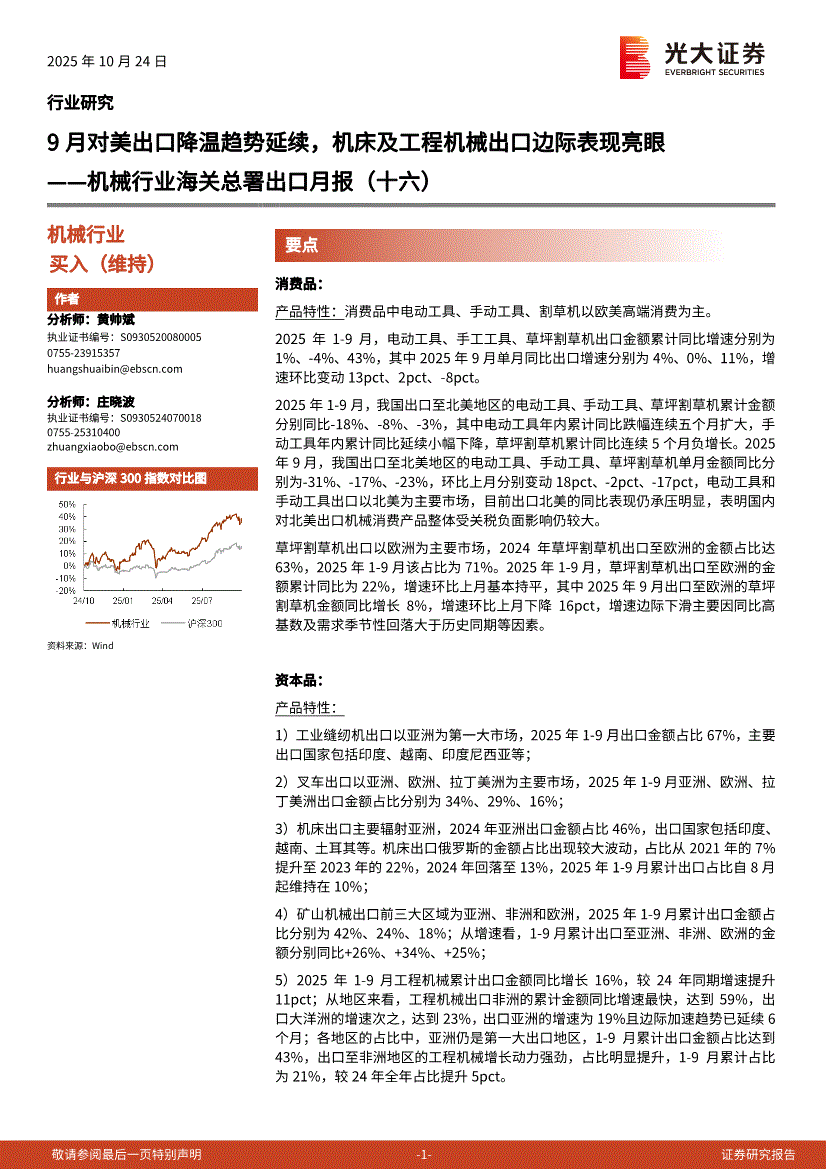 机械行业:光大证券-机械行业海关总署出口月报(十六):9月对美出口降温趋势延续,机床及工程机械出口边际表现亮眼-251024