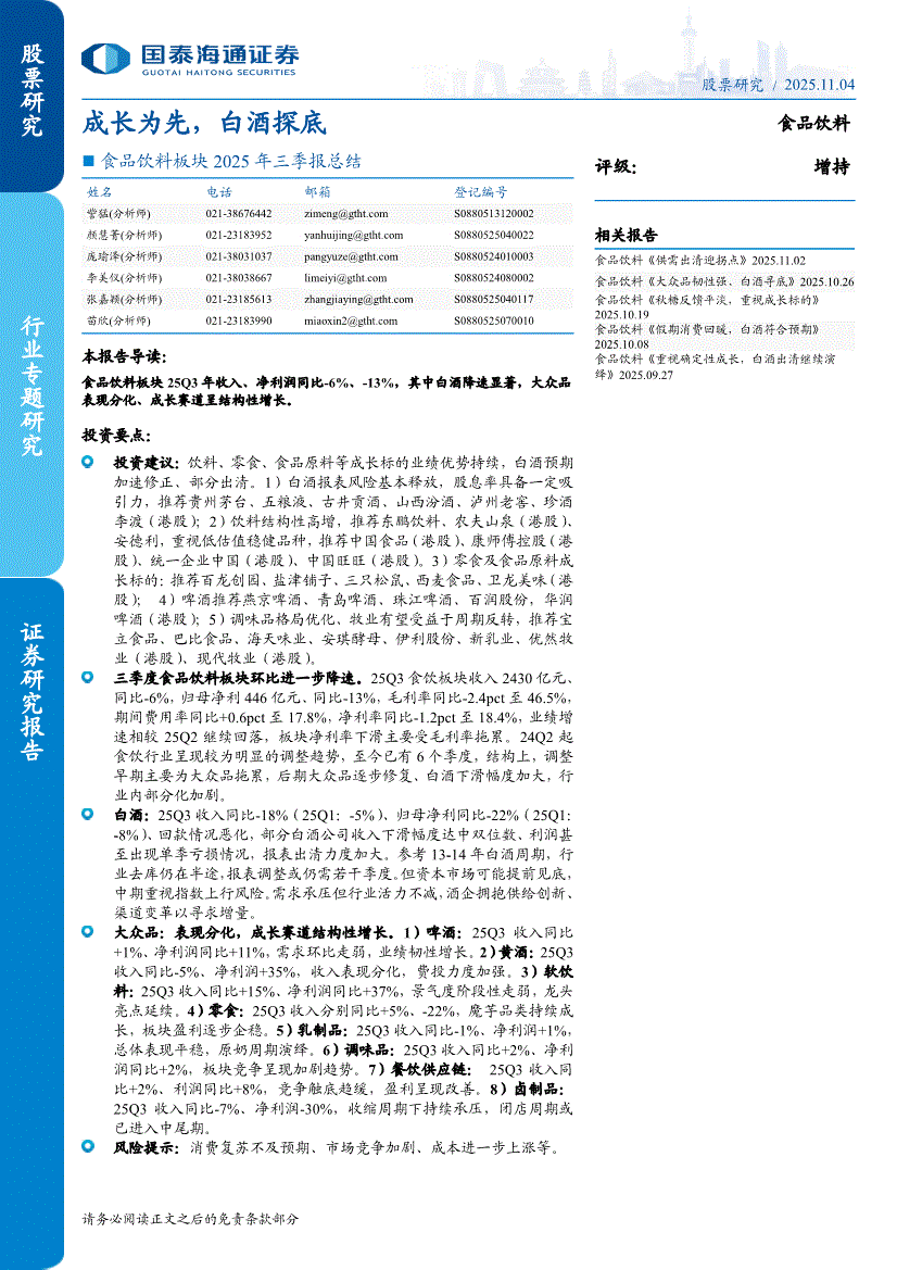 食品饮料行业:国泰海通证券-食品饮料行业板块2025年三季报总结:成长为先,白酒探底-251104