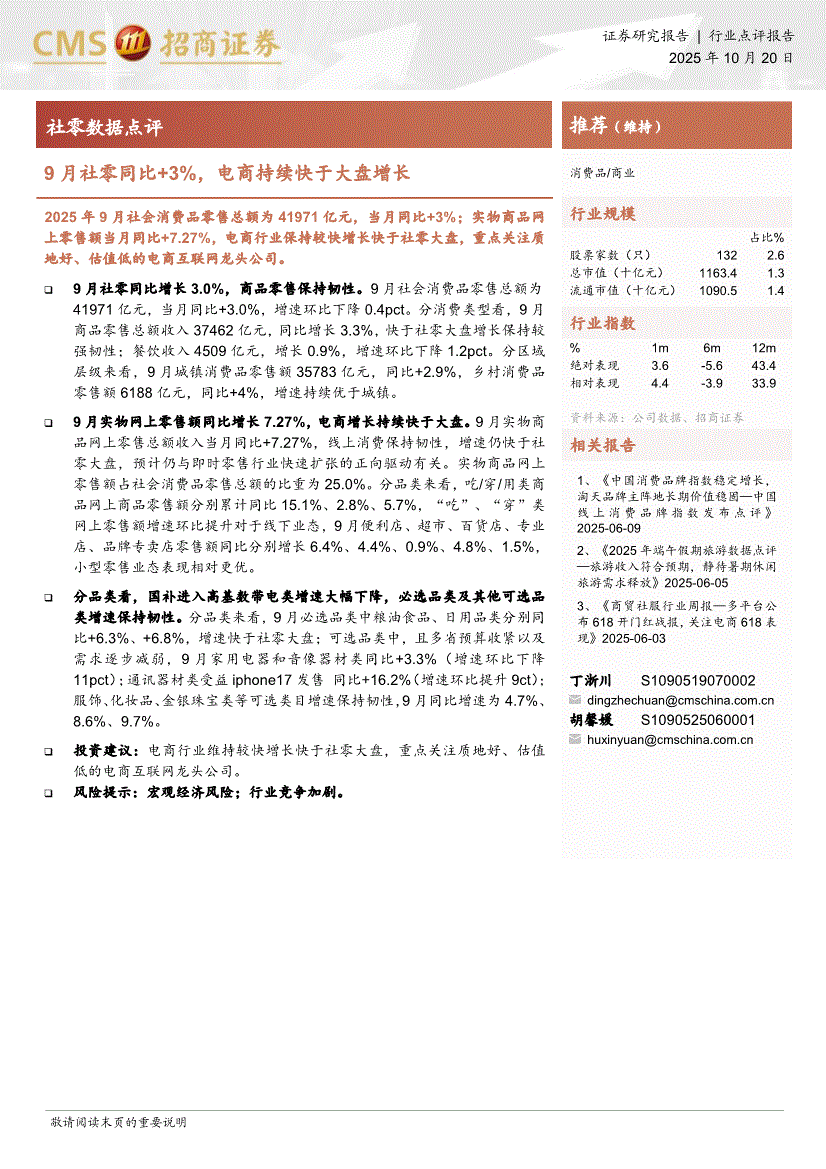 社零行业:招商证券-社零行业数据点评:9月社零同比+3%,电商持续快于大盘增长-251020