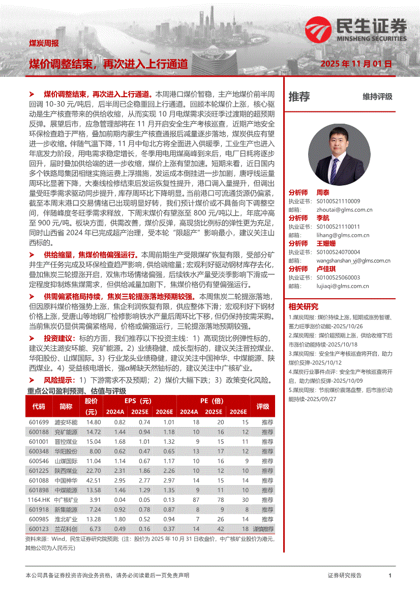 煤炭行业:民生证券-煤炭行业周报:煤价调整结束,再次进入上行通道-251101