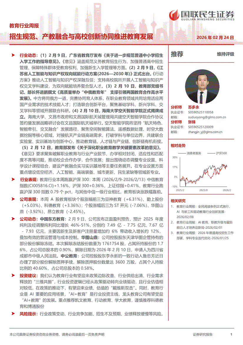 教育行业:国联民生证券-教育行业周报:招生规范、产教融合与高校创新协同推进教育发展-260224