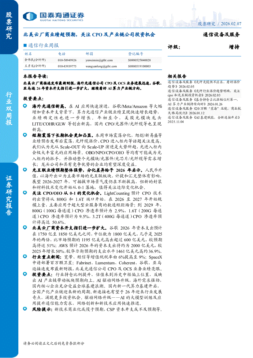 国泰海通证券-通信行业周报:北美云厂商业绩超预期,关注CPO及产业链公司投资机会-260207