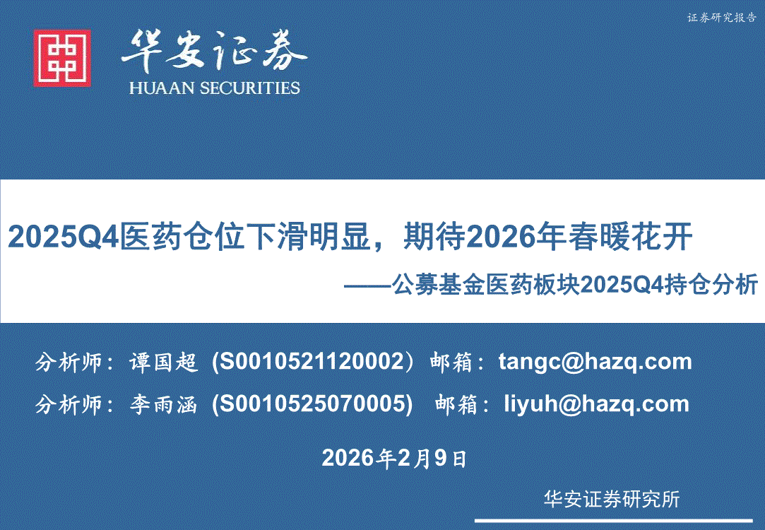 医药行业:华安证券-公募基金医药行业板块2025Q4持仓分析:2025Q4医药仓位下滑明显,期待2026年春暖花开-260209