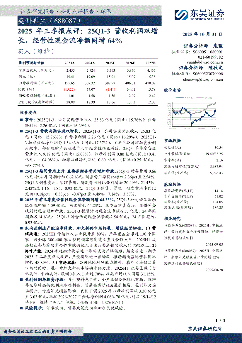 英科再生:东吴证券-英科再生-688087-2025年三季报点评:25Q1~3营收利润双增长,经营性现金流净额同增64%-251031