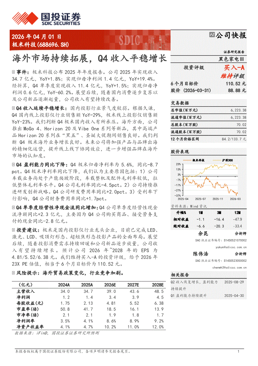 极米科技:国投证券-极米科技-688696-海外市场持续拓展,Q4收入平稳增长-260401