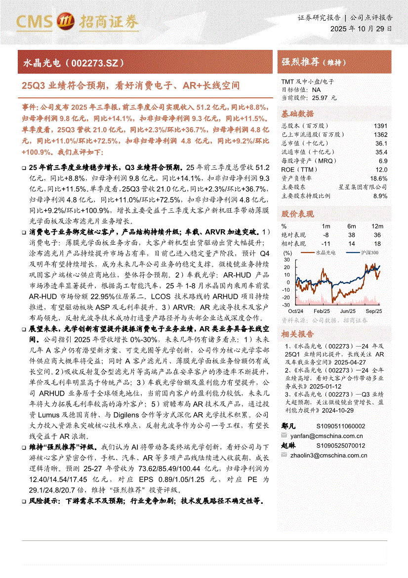 水晶光电:招商证券-水晶光电-002273-25Q3业绩符合预期,看好消费电子、AR+长线空间-251029