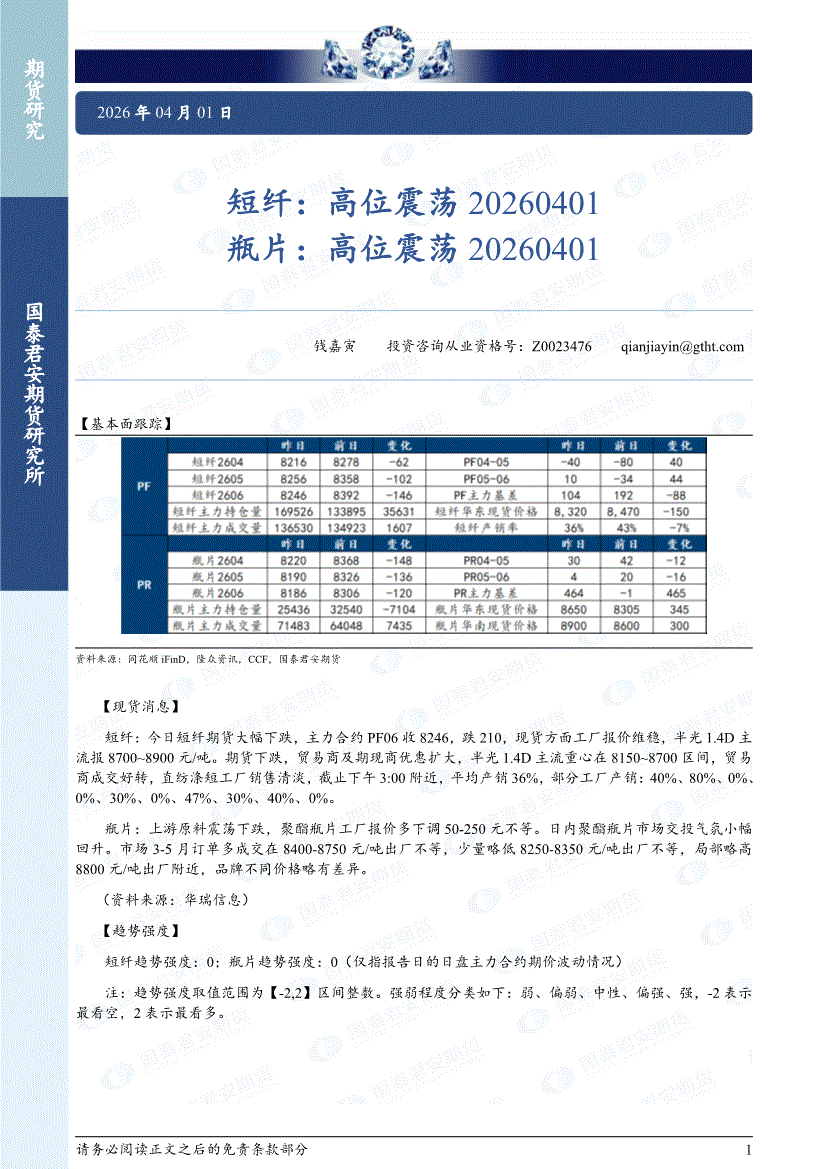 国泰君安期货-短纤:高位震荡,瓶片,高位震荡-260401