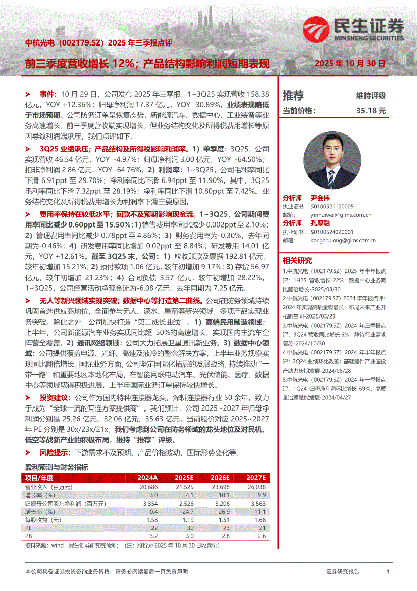 中航光电:民生证券-中航光电-002179-2025年三季报点评:前三季度营收增长12%;产品结构影响利润短期表现-251030