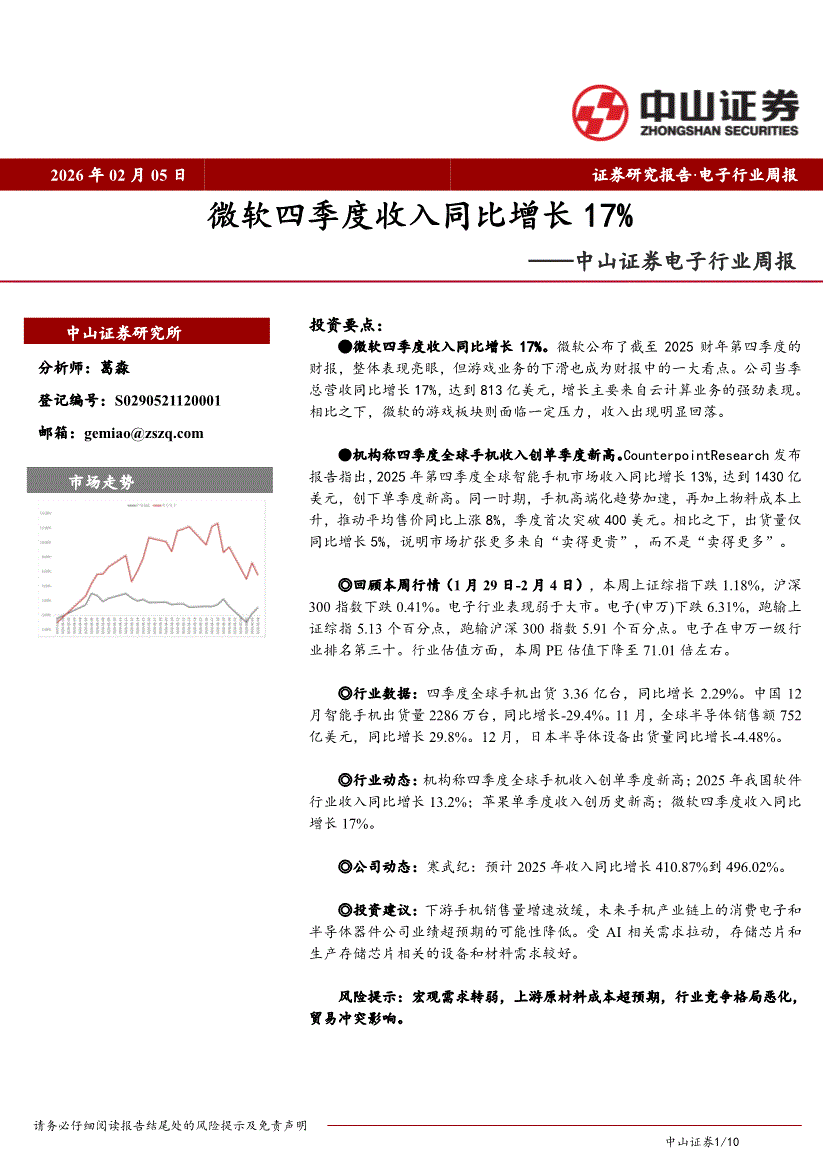 电子行业:中山证券-电子行业周报:微软四季度收入同比增长17%-260205