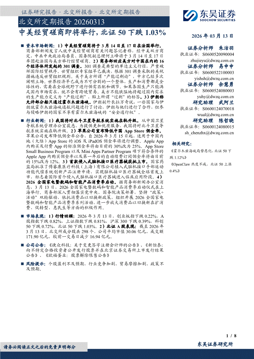 东吴证券-北交所定期报告:中美经贸磋商即将举行,北证50下跌1.03%-260313