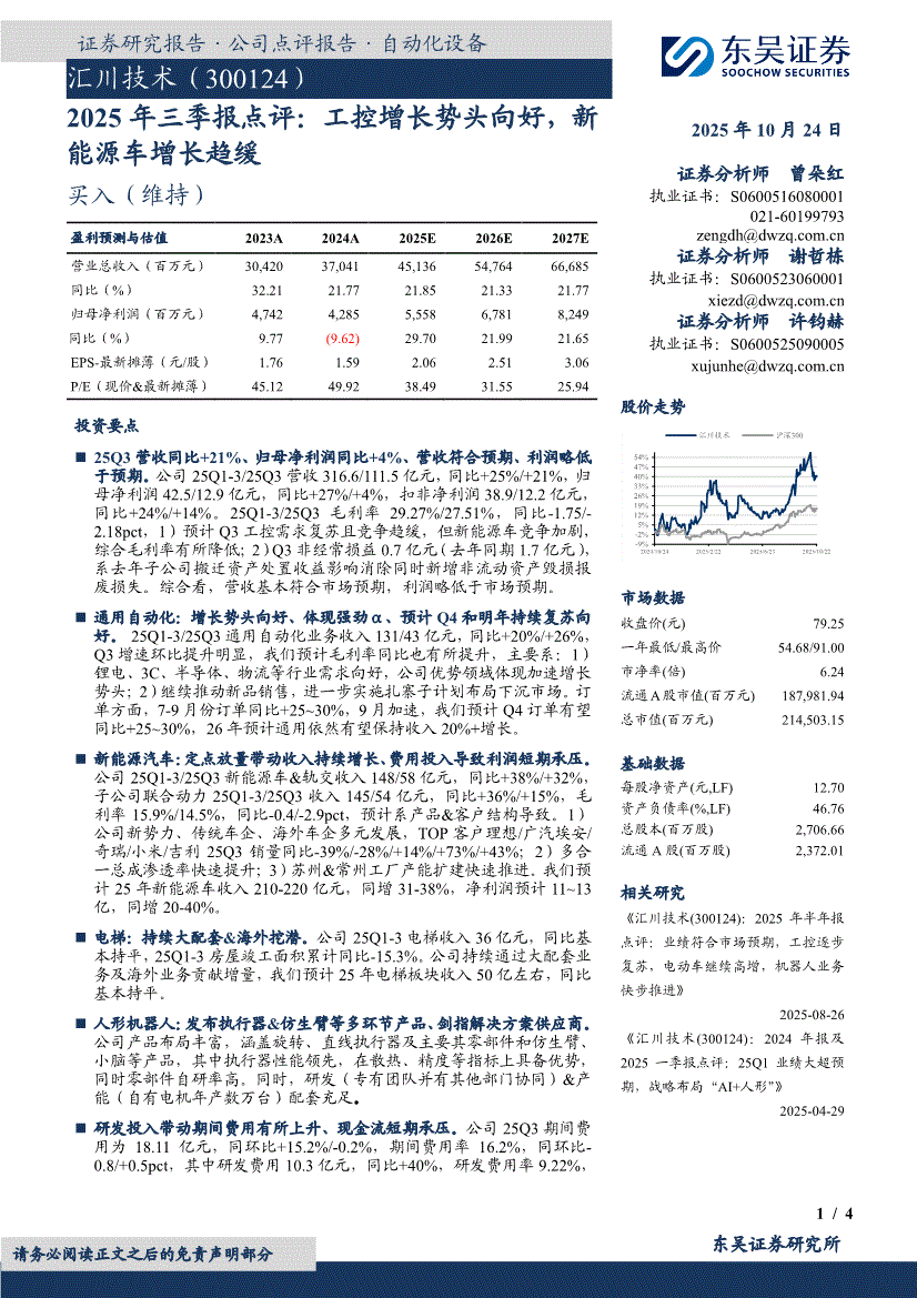 汇川技术:东吴证券-汇川技术-300124-2025年三季报点评:工控增长势头向好,新能源车增长趋缓-251024