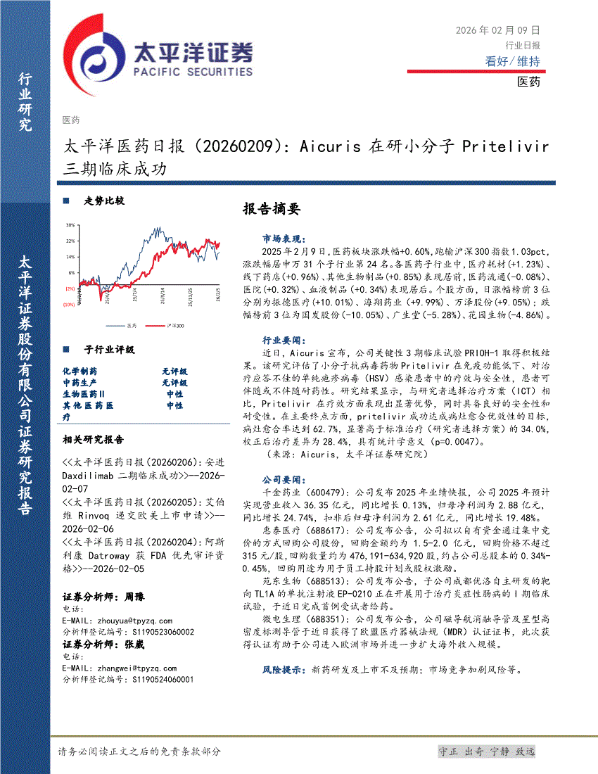 太平洋证券-医药行业日报:Aicuris在研小分子Pritelivir三期临床成功-260209