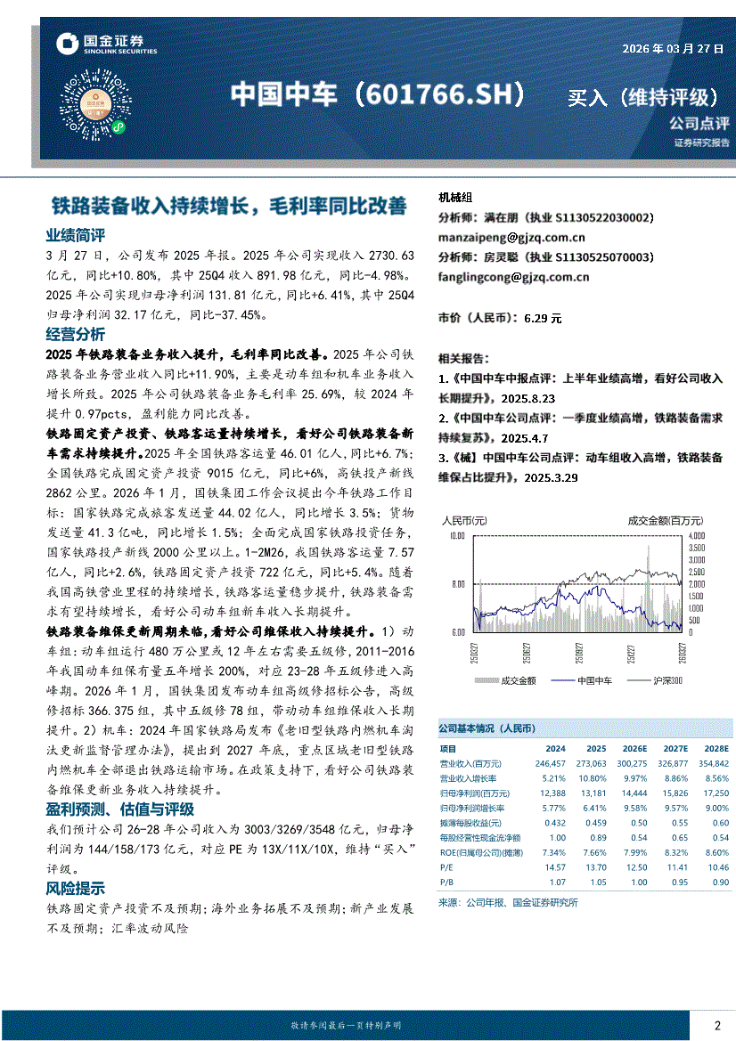 中国中车:国金证券-中国中车-601766-铁路装备收入持续增长,毛利率同比改善-260327