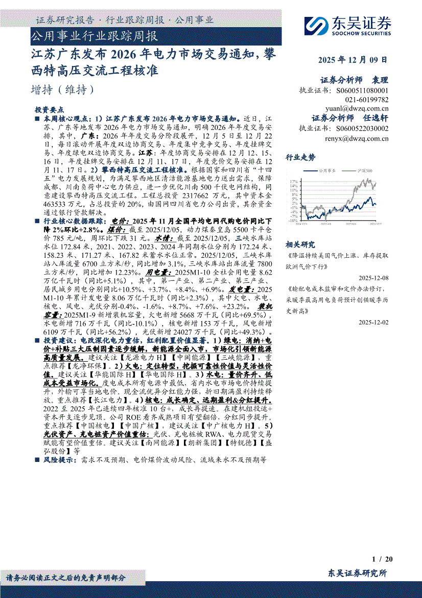 公用事业行业:东吴证券-公用事业行业跟踪周报:江苏广东发布2026年电力市场交易通知,攀西特高压交流工程核准-251209
