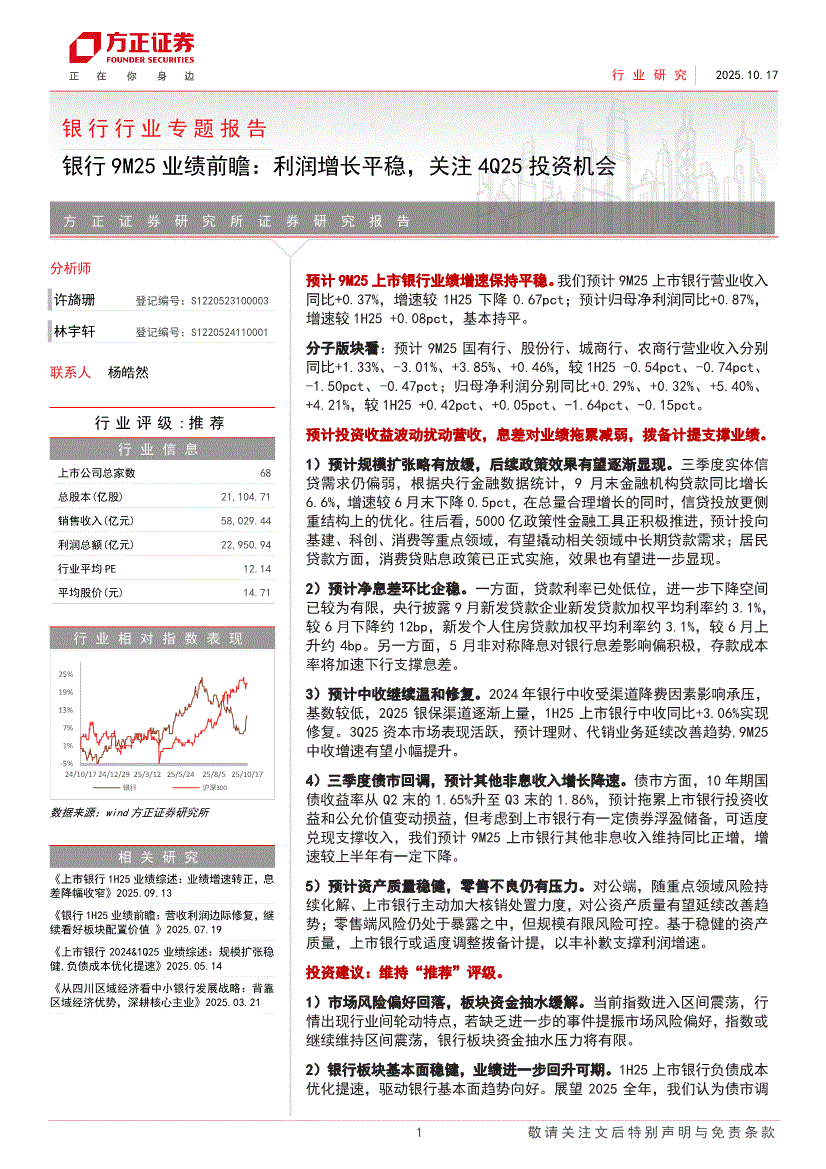 银行业:方正证券-银行行业专题报告:银行9M25业绩前瞻,利润增长平稳,关注4Q25投资机会-251017