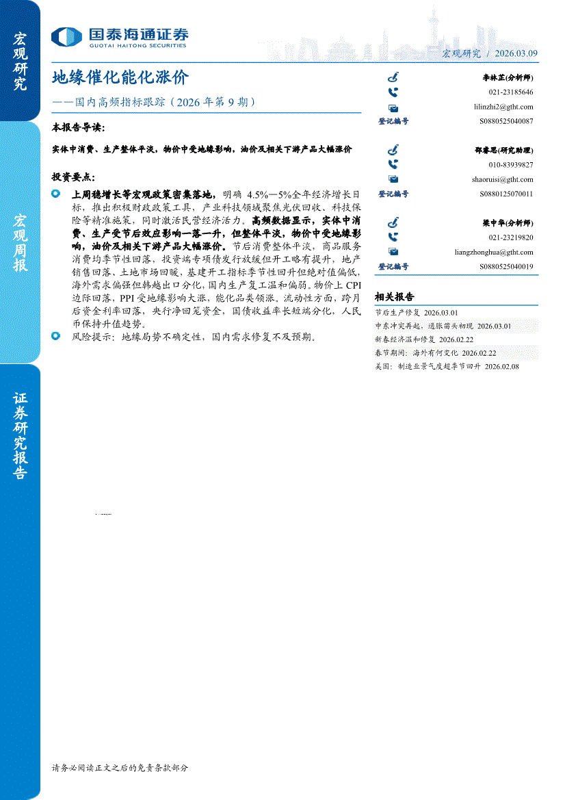 国泰海通证券-国内高频指标跟踪(2026年第9期):地缘催化能化涨价-260309