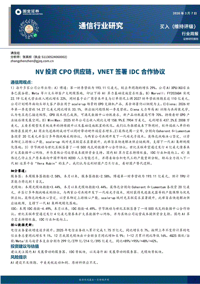 通信行业:国金证券-通信行业周报:NV投资CPO供应链,VNET签署IDC合作协议-260307