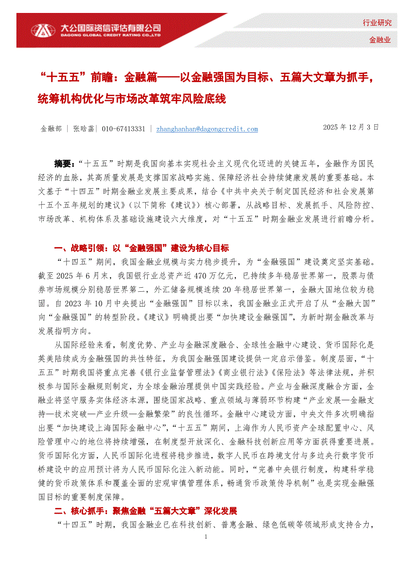 金融行业:大公国际-金融行业“十五五”前瞻:金融篇——以金融强国为目标、五篇大文章为抓手,统筹机构优化与市场改革筑牢风险底线-251203
