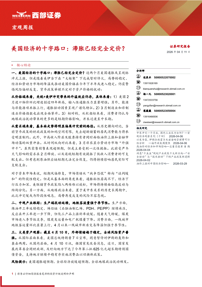 西部证券-美国经济的十字路口:滞胀已经完全定价?-260411