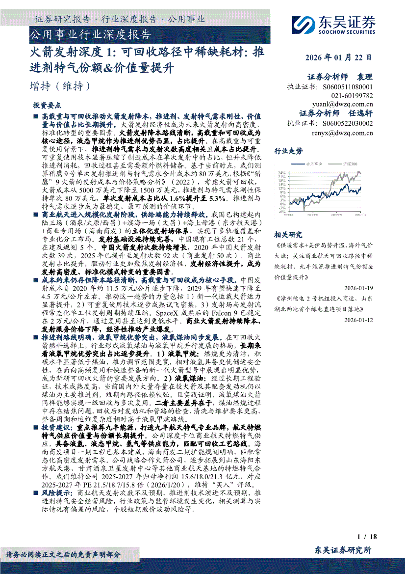 公用事业行业:东吴证券-公用事业行业深度报告:火箭发射深度1,可回收路径中稀缺耗材,推进剂特气份额&价值量提升-260122
